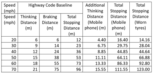 The research found similar increases in stopping distance between worn tyres and mobile usage in speeds up to 40mph. However above this, tyres were found to increase stopping distance more than phone usage.